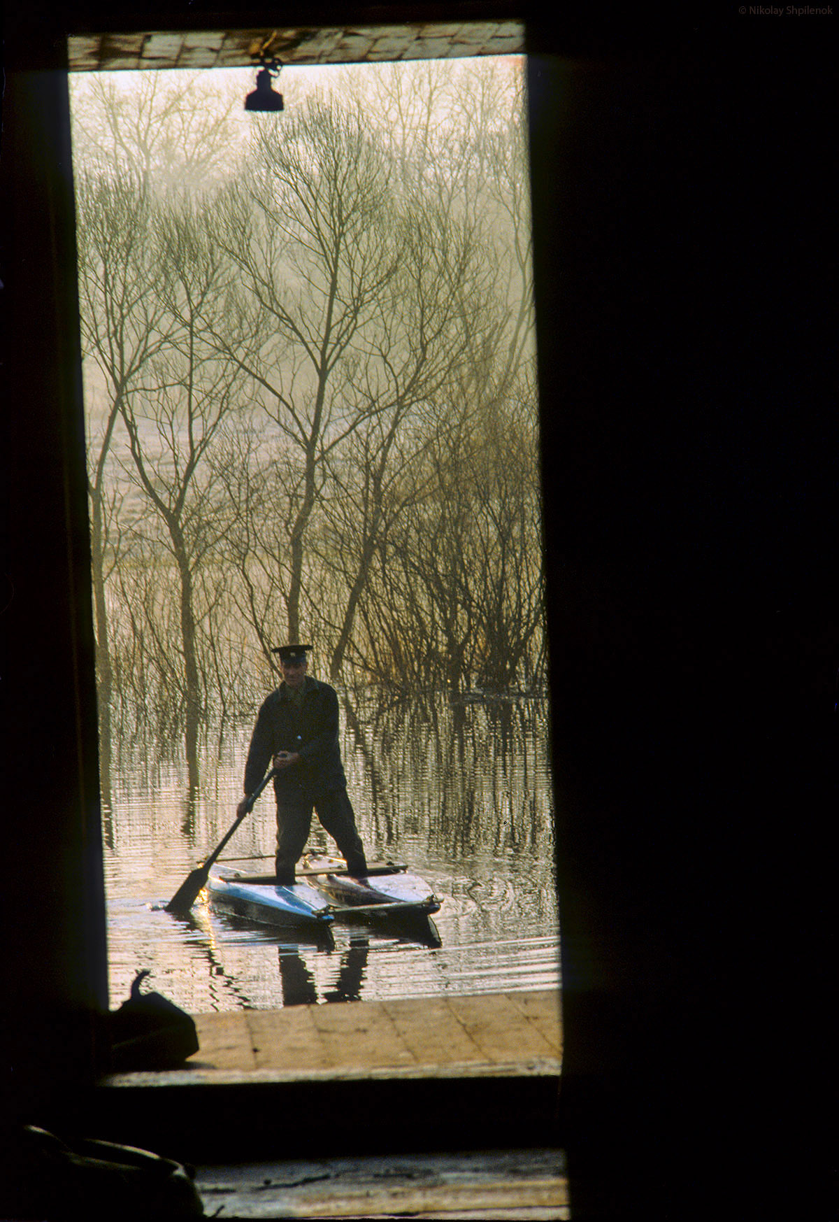 Событий на кордоне и вокруг него много. Вот лисица загнала кота на дуб и лаяла на него. В утренних сумерках шесть оленей пришли на кордон и паслись под окнами вместе с лошадью. Ночью волчата поиграли – оторвали кончик хвоста корове. Как ей теперь отгонять комаров и слепней? Никитич приладил пучок из лошадиной гривы. «Протез» исправно служил до тех пор, пока хвост не оброс заново. На снимке: во время весеннего разлива на кордоне можно подплывать прямо к крыльцу дома.