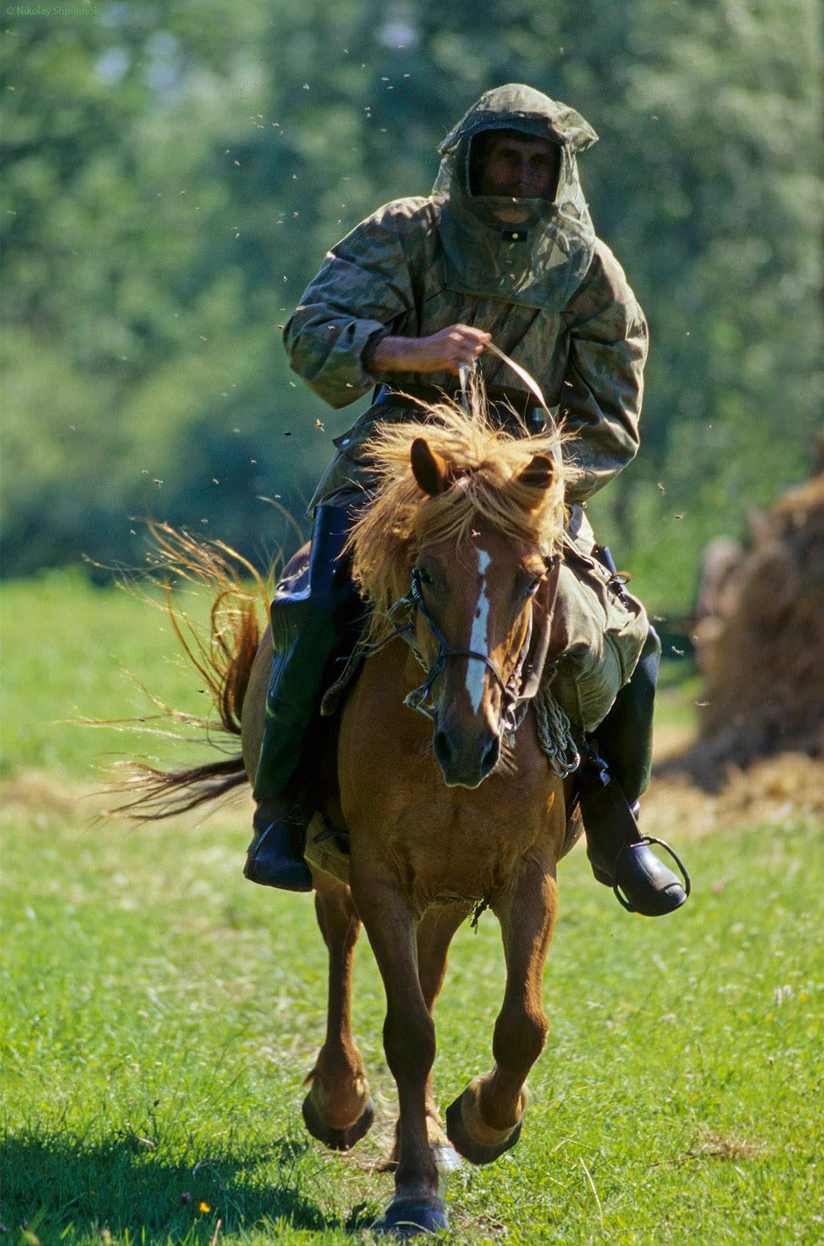 Самым страшным преступлением против природы Никитич считает электроудочку. Мощные разряды калечат рыбу, убивают всё живое – от инфузорий до жуков-плавунцов. Рыба, которая чудом выжила, уже никогда не даст потомства. Как-то туманным летним утром отец и я задержали «электорудочников» рядом с кордоном. За два часа «работы» они выловили почти три мешка рыбы. Дальше как обычно – протокол, подписи свидетелей, сдача вещдоков на склад. Но уголовное дело тогда «затерялось» в какой-то судебной инстанции. К сожалению, это часто результат предсказуемый… На снимке: брод через Неруссу, лошадь остановилась напиться воды.